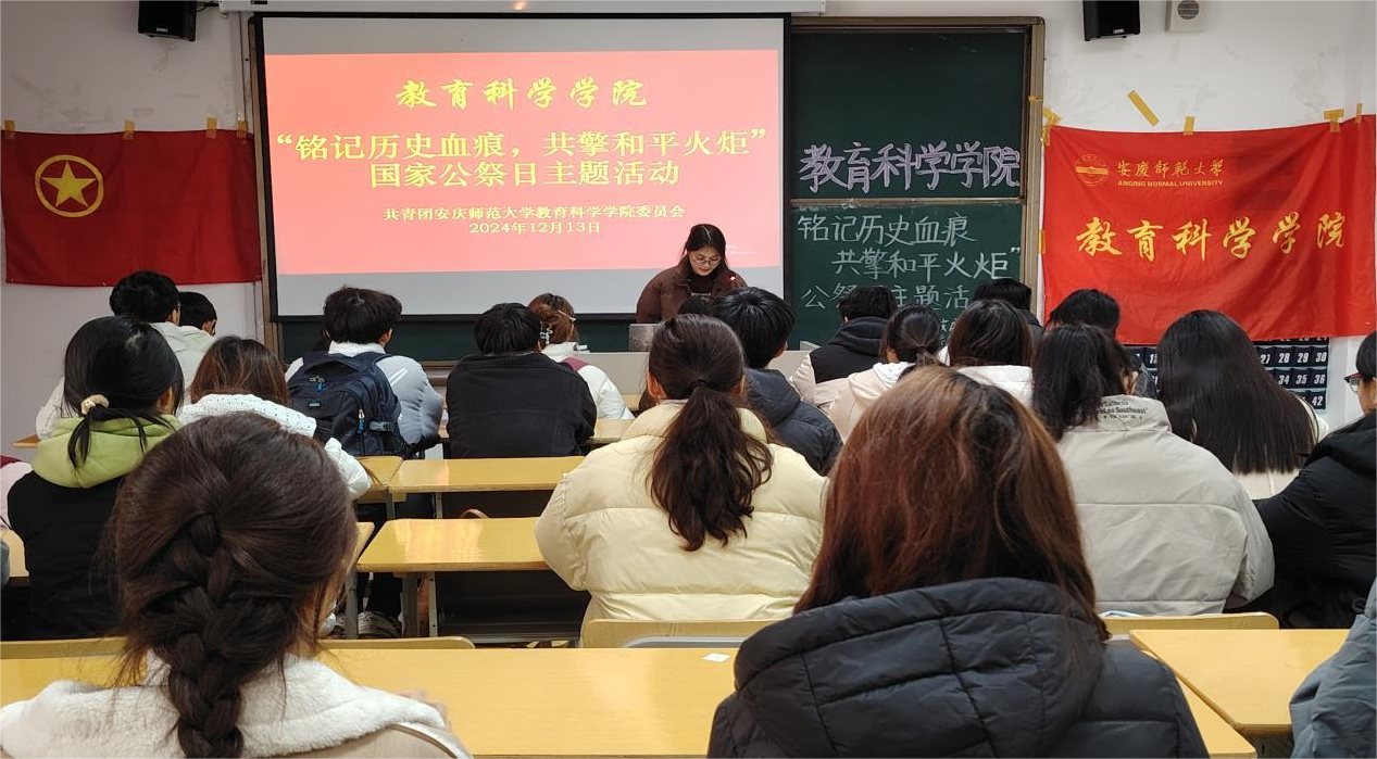于J214教室举办“铭记历史血痕,共擎和平火炬”国家公祭日主题活动。活动由院团委实践委员胡古月主持,学院150余名学子参加。