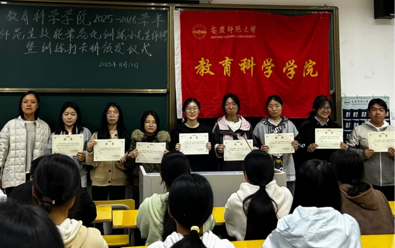 在J104教室开展2025-2026学年师范生技能常态化训练“小先生”评聘暨训练打卡册颁发仪式。院团委副书记姚强诚、新聘任的“小先生”们及2025级新生班委们到场参加。