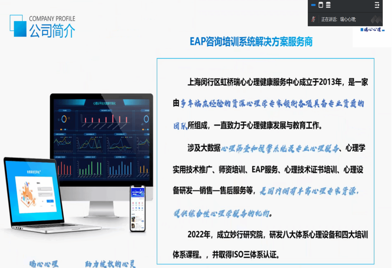 会议中,周经理根据自身经历,向同学们分析了当前就业形势、职业选择方向与发展前途,并就企业经营模式、就业岗位职责、当前用人需求及职业发展规划等方面提供了多方位的行业知识和就业信息,帮助应届毕业生深入了解,做好就业规划。随后,他通过播放宣传片、PPT展示、线上连线交流的方式从公司概况、发展历程以及核心规划等多个方面为同学们介绍工作岗位和工作情况,本公司一直致力于心理健康发展与教育工作,涉及大数据心理筛选,EPA服务等方面。