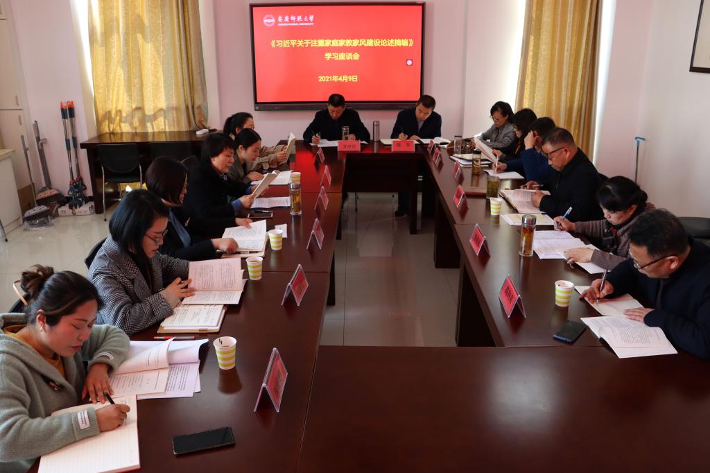 教师教育学院组织安庆家庭教育研究指导中心部分研究人员召开《习近平关于注重家庭家教家风建设论述摘编》学习座谈会,安庆市妇联主席焦玲、副主席张莉、我校“女生工作坊”负责人陈银凤应邀出席会议。安庆教育研究指导中心理事会成员和学术委员会委员参加会议,会议还邀请了安庆市委党校、安庆市家庭教育讲师团部分教师参加会议。