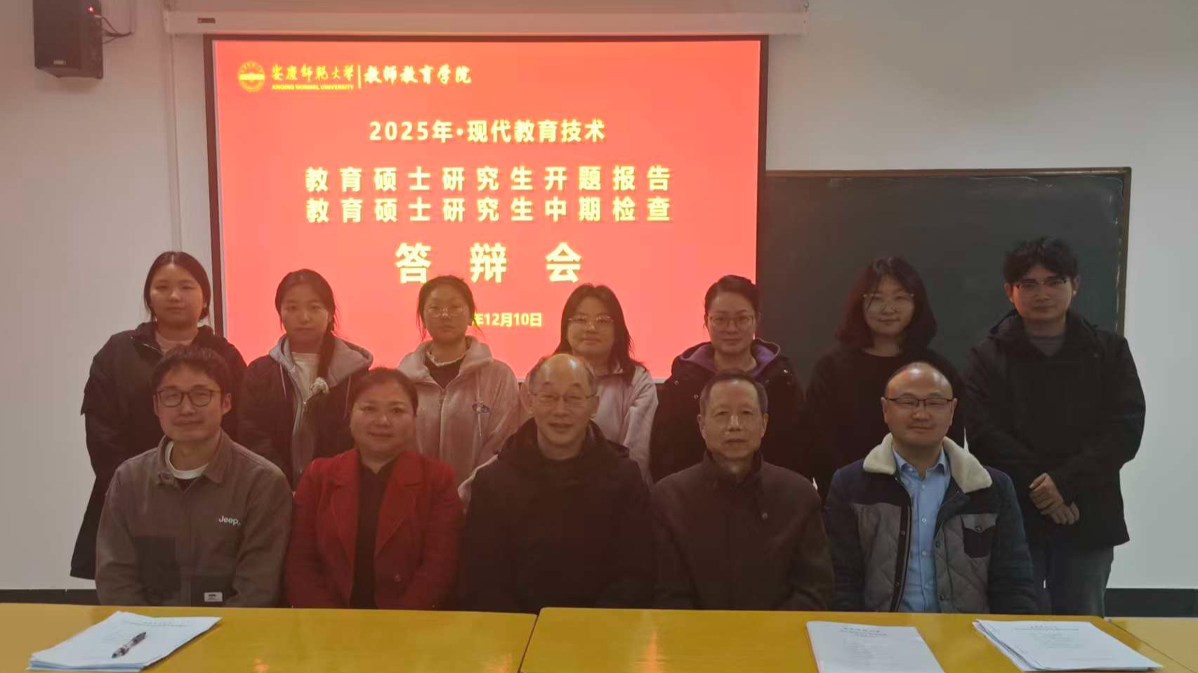 现代教育技术专业开展教育硕士开题报告与中期检查专项工作。本次活动邀请基础教育一线教育专家江浩(安庆市现代教育技术中心,正高级教师)、王志萍(安庆市第十四中学,高级教师),以及校内教师韩建华、韦伟、朱斌彬、方申荣组成评审小组。现代教育技术专业全体研究生和教育技术学专业部分本科生参加活动。