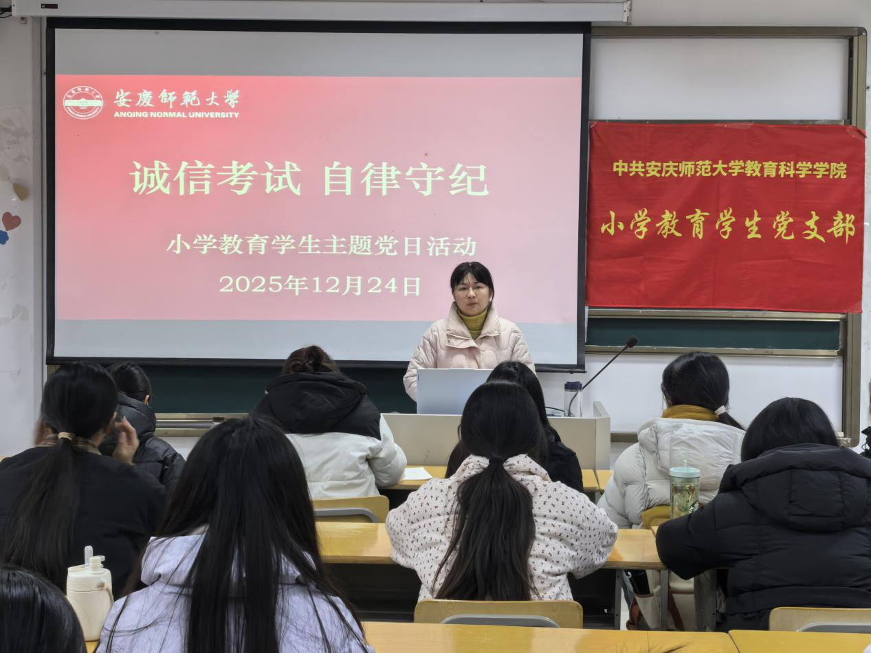 为强化学风建设、营造诚信考风,12月24日,98色花堂 小学教育学生党支部在J221教室组织开展“诚信考试,自律守纪”主题党日活动。活动由党支部书记张文君主持,全体学生党员与入党积极分子参加。