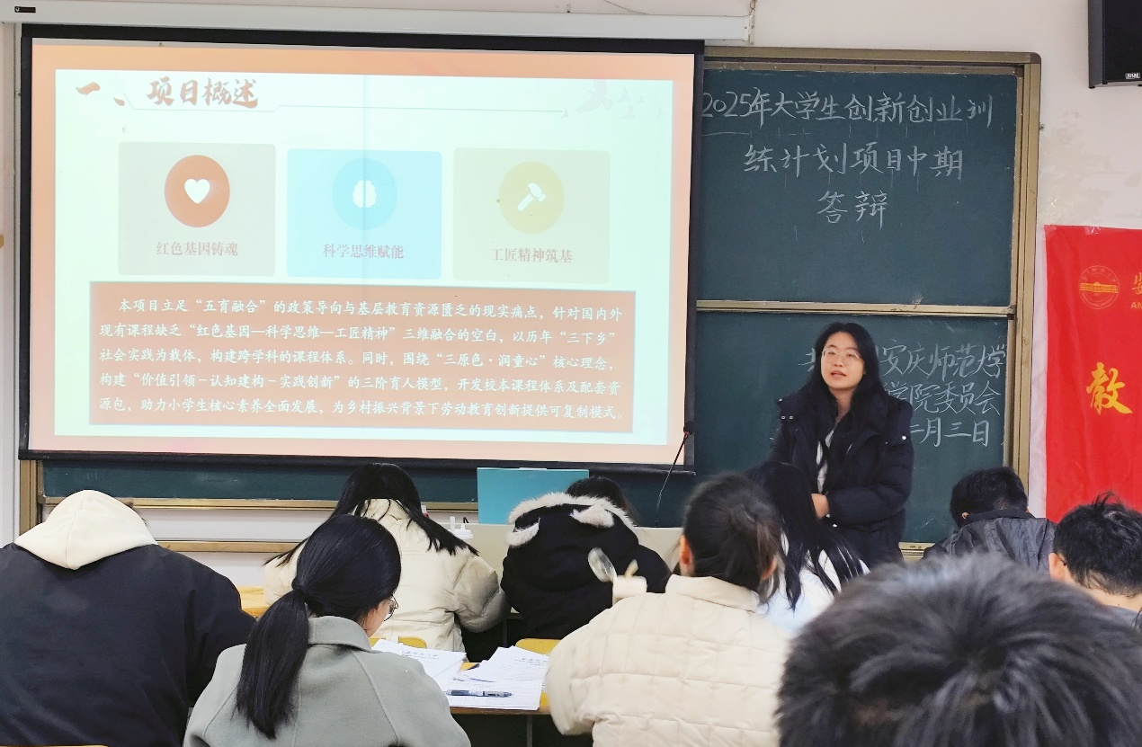 在J221教室开展2025年大学生创新创业训练计划项目中期答辩。学院副院长王皓宇、院团委副书记姚强诚,专职辅导员后娇娇及研究生程文彦、赵理想担任评委,院团委实践委员瞿倪主持。全院共14支项目组团队参与汇报。